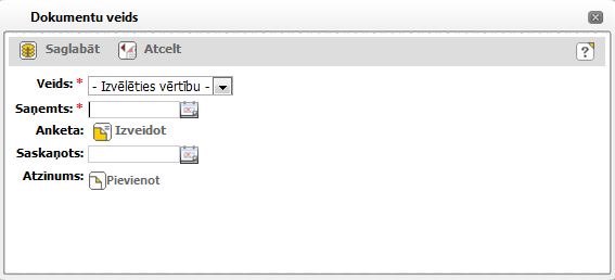 Noklikšķinot ļauj izveidot lietvedības modulī jaunu dokumentu (anketu). Pēc dokumenta saglabāšanas laukā Anketa tiek parādīts dokumenta nosaukums. Dokumentu veidošanas aprakstu skatīt 25.3Scenārijs: Jauna dokumenta izveidošana. |