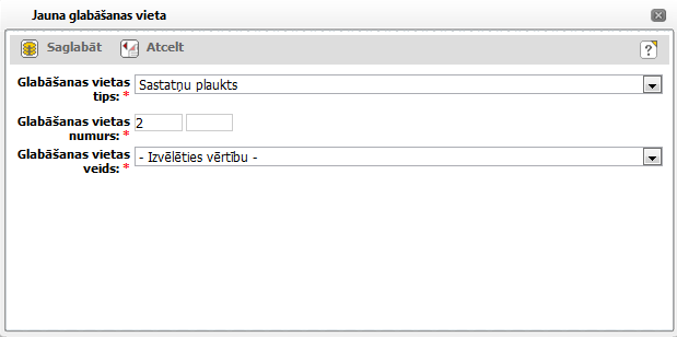 Attēlo divus ievadlaukus. Pirmajā glabāšanas vietas numurs. Kā noklusētā lauka vērtība tiek attēlots nākamais kārtas numurs glabāšanas vietai. Otrs glabāšanas vietas numura ievadlauks paredzēts litera ievadei. |