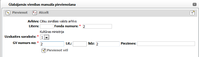 Piezīme! Manuāli var pievienot tās glabājamās, kuras ir sistēmā. Ja sistēmā glabājamās vienības nav, pēc [Pievienot] noklikšķināšanas, tiks attēlots paziņojums, ka šādas glabājamās vienības netika pievienotas.