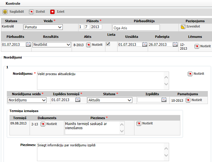 Nevar dzēst tādu kontroles ierakstu, kuram ir piesaistīts kāds norādījums. Pārliecinieties, ka kontrole tiešām jādzēš. Vispirms izdzēsiet visus norādījumus. |