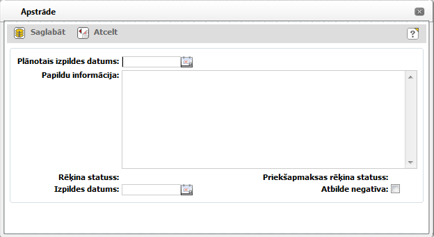 Pieprasījuma izpildes datums. Piezīme! Norādot izpildes datumu, pieprasījuma statuss tiek nomainīts uz ‘Izpildīts’! Datumu var norādīta klienta pieprasījumam statusos ‘Reģistrēts’, ‘Apstrādē’ un ‘Rēķins apmaksāts’! |