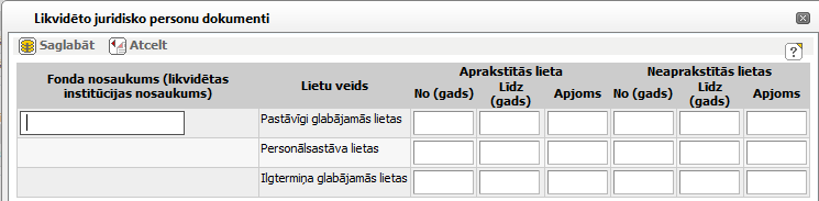 Logs ‘Likvidēto juridisko personu dokumenti’ paredzēts, lai pievienotu vai labotu likvidētās juridiskās personas dokumentu informāciju.