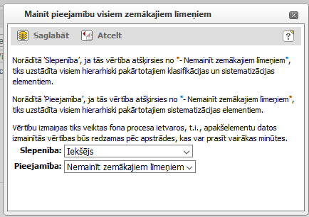 Norādiet slepenības un pieejamības informāciju, kuru nepieciešams uzstādīt visām hierahiski pakārtotajām apraksta vienībām, vai arī kādā no izvēlnēm norādiet ‘Nemainīt zemākajiem līmeņiem’, ja vērtību nevajag mainīt, un noklikšķiniet uz [Saglabāt].