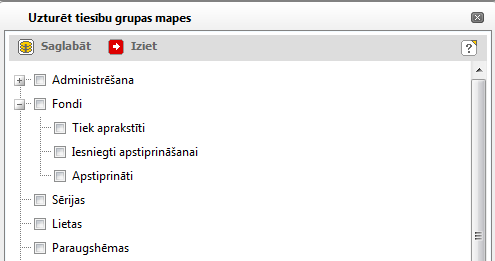 Atzīmējiet mapes, kuras jāiekļauj mapju tiesību grupā un noņemiet atzīmes no tām mapēm, kuras nav jāiekļauj tiesību grupā un noklikšķiniet uz [Saglabāt]. Ja tiek atzīmēta mape, kurai ir virsmape, tad atzīme tiek uzstādīta arī virsmapei.