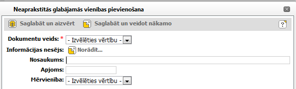 Noklikšķinot sistēma atver uznirstošo logu skat. aprakstu 13.1.1.2Uznirstošais logs: Pievienot vai labot glabājamā vienības informācijas nesēju) glabājamās vienības informācijas nesēja norādīšanai. Nav pieejama, ja informācijas nesējs jau ir norādīts. |