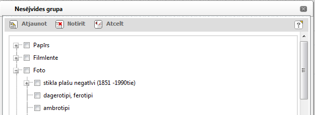 Bloks, kurā hierarhiski tiek attēlotas nesējvides grupas. Ja kādai no nesējvides grupām ir zemāka līmeņa nesējvides grupa, tad tai tiek blakus attēlota "+" zīme, ko izmanto, lai izvērstu nesējvides grupas līmeni. Ja kāds nesējvides grupas līmenis ir izvērsts, tad tam blakus tiek attēlota "-" zīme, ko izmanto, lai savērstu nesējvides grupas līmeni. Ja nesējvides grupa nav norādīta, tiek attēloti pirmā līmeņa informācijas nesēji savērstā veidā. Ja nesējvides grupa ir norādīta, tad nesējvides grupas attēlo izvērstas līdz šim norādītajam nesējvides grupas līmenim un 'Izvēlētā nesējvides grupa' ir izcelta. |