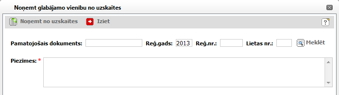 Logs „Noņemt glabājamo vienību no uzskaites” paredzēts glabājamās vienības noņemšanai no uzskates pamatojošā dokumenta norādei un piezīmju ievadīšanai.