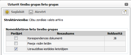 Atzīmējiet tās nomenklatūras lietas, ka jāiekļauj tiesību grupā un noklikšķiniet uz [Saglabāt].