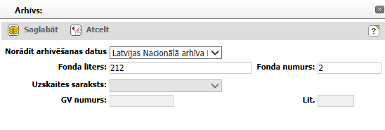Izvēle fonda uzskaites saraksta norādīšanai. Ja fonds nav atrasts, šis saraksts nav pieejams. Ja norādīts uzskaites saraksts, jānorāda arī glabājamās vienības numurs. |