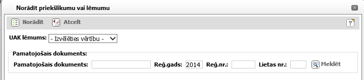 Noklikšķinot tiek dzēsts pievienotais pamatojošais dokuments no Priekšlikuma UAK norādīšanas loga. Darbība pieejama, ja pamatojošais dokuments ir norādīts. |