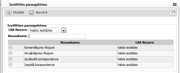 Noklikšķinot tiek veikta paraugshēmu atlase pēc norādītās nozares un nosaukuma. |