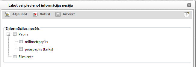 Bloks, kurā hierarhiski tiek attēlotas informācijas nesēju vērtības. Ja kādam no informācijas nesējiem ir zemāka līmeņa informācijas nesēji, tad tam tiek blakus attēlota "+" zīme, ko izmanto, lai izvērstu informācijas nesēja līmeni. Ja kāds informācijas nesēja līmenis ir izvērsts, tad tam blakus tiek attēlota "-" zīme, ko izmanto, lai savērstu informācijas nesēja līmeni. Ja informācijas nesējs apraksta vienībai nav norādīts, blokā ‘Informācijas nesējs’ tiek attēloti pirmā līmeņa informācijas nesēji savērstā veidā. Ja informācijas nesējs apraksta vienībai ir norādīts, blokā ‘Informācijas nesējs’ informācijas nesējus attēlo izvērstus līdz šim informācijas nesējam un 'Izvēlētais informācijas nesējs' ir izcelts. |