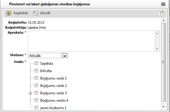 Bojājuma veids. Vērtību izvēle no klasifikatora ‘Glabājamo vienību bojājumi’. Ja kādam no bojājuma klasifikatora ir zemāka līmeņa bojājumi, tad tam tiek blakus attēlota "+" zīme, ko izmanto, lai izvērstu bojājuma klasifikatora līmeni. Ja kāds klasifikatora bojājuma līmenis ir izvērsts, tad tam blakus tiek attēlota "-" zīme, ko izmanto, lai savērstu klasifikatora bojājuma līmeni. Ja glabājamai vienībai bojājums tiek labots, tad bojājumu vērtības no klasifikatora attēlo izvērstus līdz norādītam bojājumam. Ja glabājamai vienībai bojājums tiek pievienots, tad attēlo tikai pirmā līmeņa bojājumus savērstā veidā un neviens bojājums nav atzīmēts. Ja bojājumam ir statuss ‘Novērsts’, vērtības nav labojamas. |