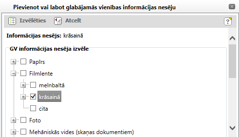 Bloks, kurā hierarhiski tiek attēlotas informācijas nesēju vērtības. Ja kādam no informācijas nesējiem ir zemāka līmeņa informācijas nesēji, tad tam tiek blakus attēlota "+" zīme, ko izmanto, lai izvērstu informācijas nesēja līmeni. Ja kāds informācijas nesēja līmenis ir izvērsts, tad tam blakus tiek attēlota "-" zīme, ko izmanto, lai savērstu informācijas nesēja līmeni. Ja informācijas nesējs glabājamai vienībai nav norādīts, blokā ‘GV informācijas nesēja izvēle’ tiek attēloti pirmā līmeņa informācijas nesēji savērstā veidā. Ja informācijas nesējs glabājamai vienībai ir norādīts, blokā ‘GV informācijas nesēja izvēle’ informācijas nesējus attēlo izvērstus līdz šim informācijas nesējam un 'Izvēlētais informācijas nesējs' ir izcelts. |