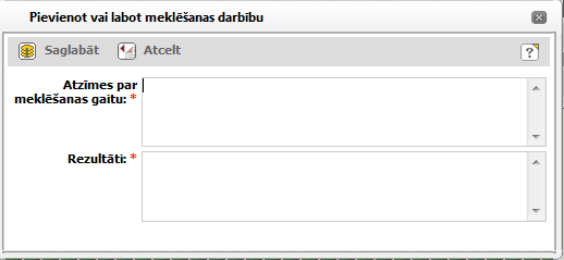 Logs paredzēts glabājamās vienības meklēšanas darbību pievienošanai vai labošanai. Meklēšanas darbību var pievienot iztrūkumam, ja tā statuss ir ‘Aktuāls’ vai ‘Meklēšanā’.