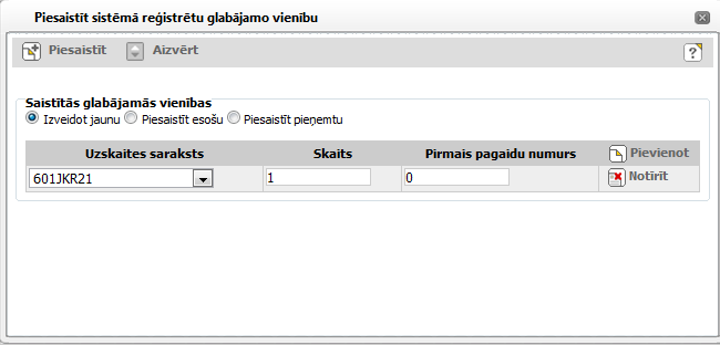 Ja ir atzīmēta radiopoga ‘Izveidot jaunu’, norādīts uzskaites saraksts, skaits un pirmais pagaidu numurs (glabājamās vienības numurs, kuru piešķir/norāda uzraudzības iestāde), tad noklikšķinot uz [Piesaistīt], sistēmā tiek izveidotas un piesaistītas apraksta vienībai tik jaunas glabājamās vienības, cik norādīts skaits, un šīm glabājamām vienībām secīgi tiek piešķirts pagaidu numurs.