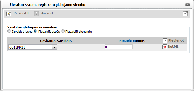 Ja ir atzīmēta radiopoga ‘Piesaistīt esošu’, tad noklikšķinot uz [Piesaistīt] apraksta vienībai tiek piesaistīta glabājamā vienība no uzskaites saraksta ar norādīto pagaidu glabājamās vienības numuru.