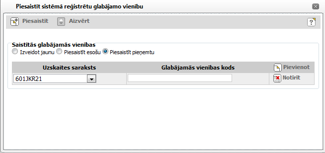 Ja ir atzīmēta radiopoga ‘Piesaistīt pieņemtu’, tad noklikšķinot uz [Piesaistīt] apraksta vienībai tiek piesaistīta glabājamā vienība no uzskaites saraksta ar norādīto glabājamās vienības kodu.