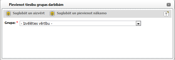 Lai darbību pievienotu tiesību grupai, Darbības logā noklikšķiniet [Pievienot].
