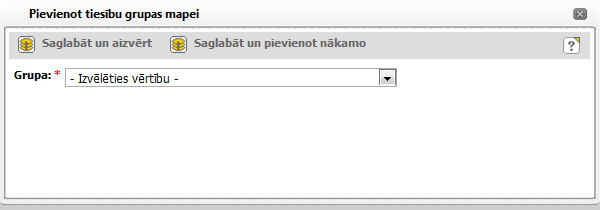 Norādiet tiesību grupu, kuru jāpievieno mapei un noklikšķiniet uz [Saglabāt un aizvērt]. Ja mapei jāpievieno vēl kāda tiesību grupa, noklikšķiniet uz [Saglabāt un pievienot nākamo].