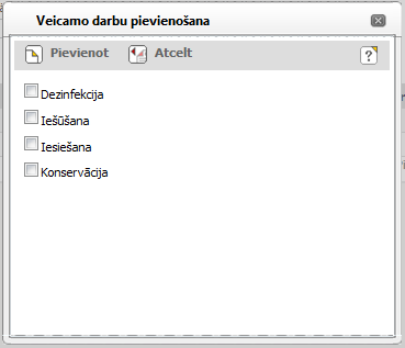 Logā tiek attēlotas visas klasifikatora ‘Veicamie darbi’ vērtības, kurām ir atzīmēts, ka darbu var veikt laboratorijā vai laboratorijā un glabātavā. |
